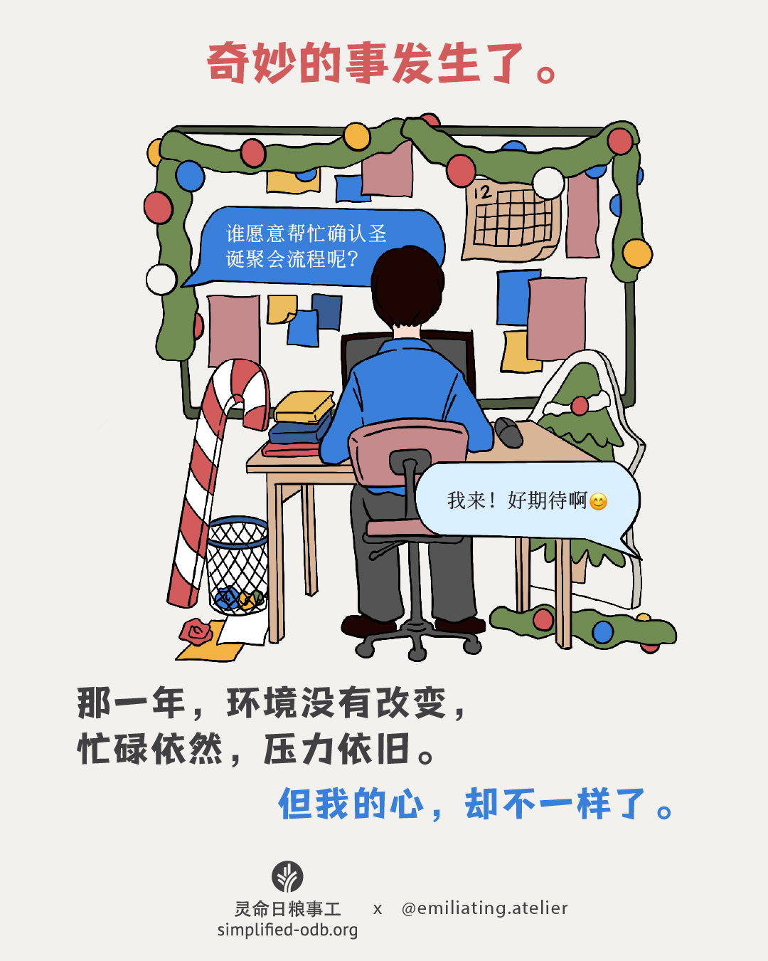 透过这系列插画,一起看看一个人如何从厌倦节日的忙碌,到重新发现耶稣带来的喜乐与平安。