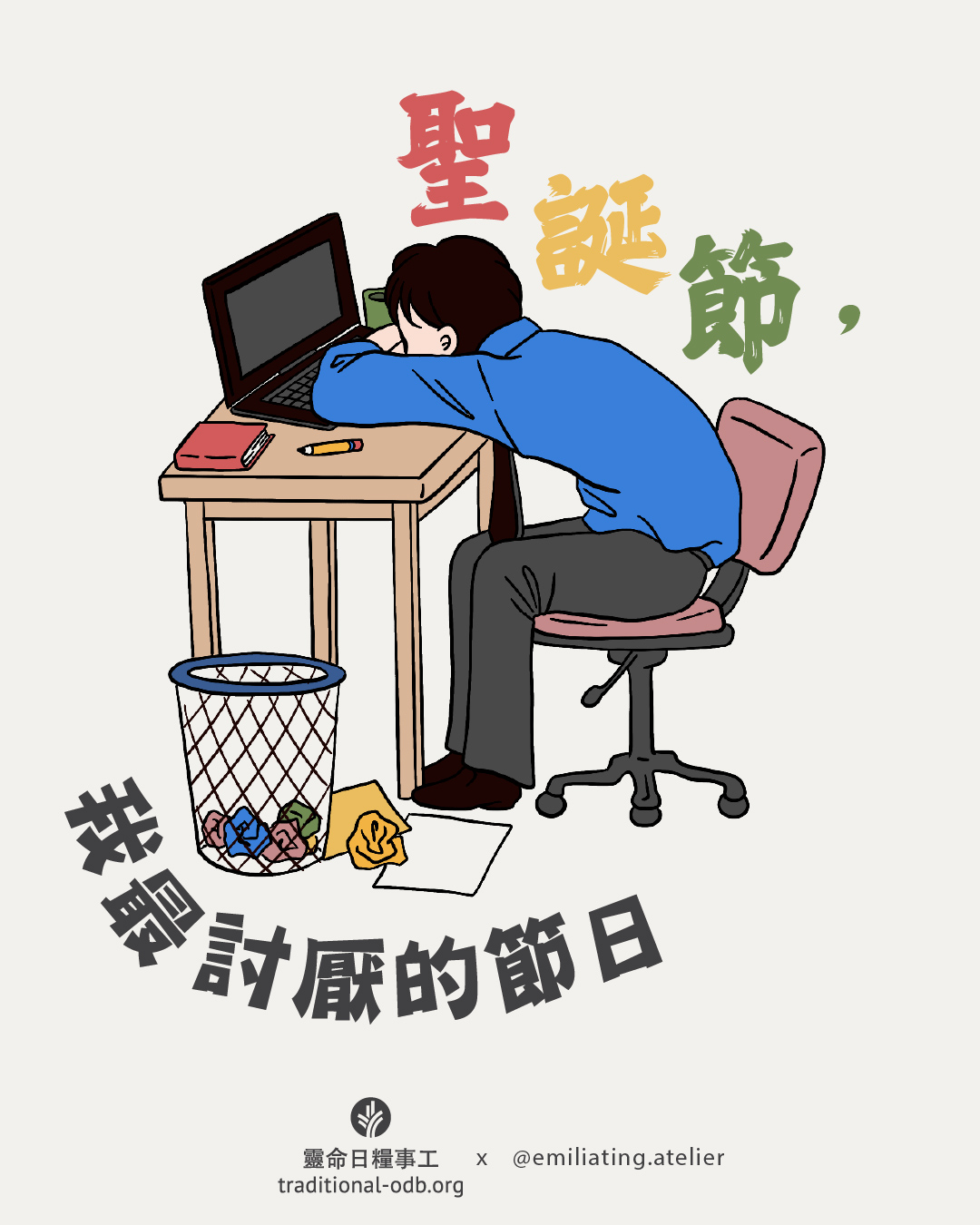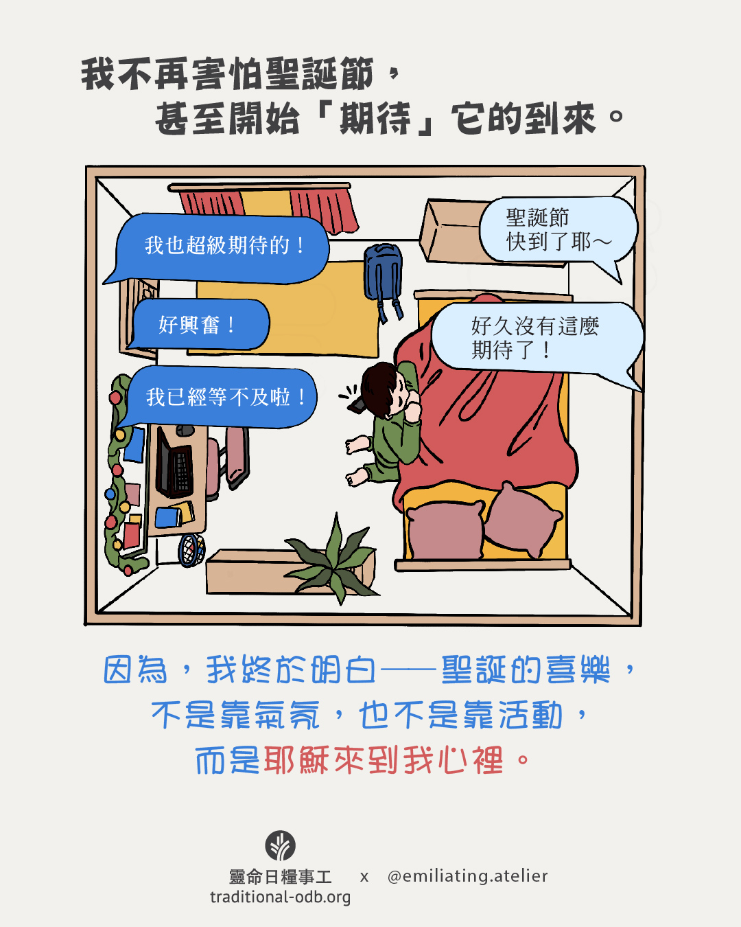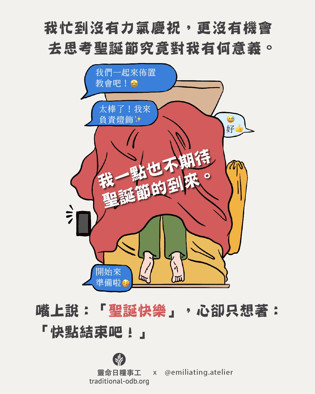 透過這系列插畫,一起看看一個人如何從厭倦節日的忙碌,到重新發現耶穌帶來的喜樂與平安。