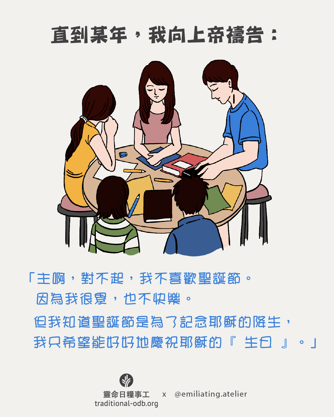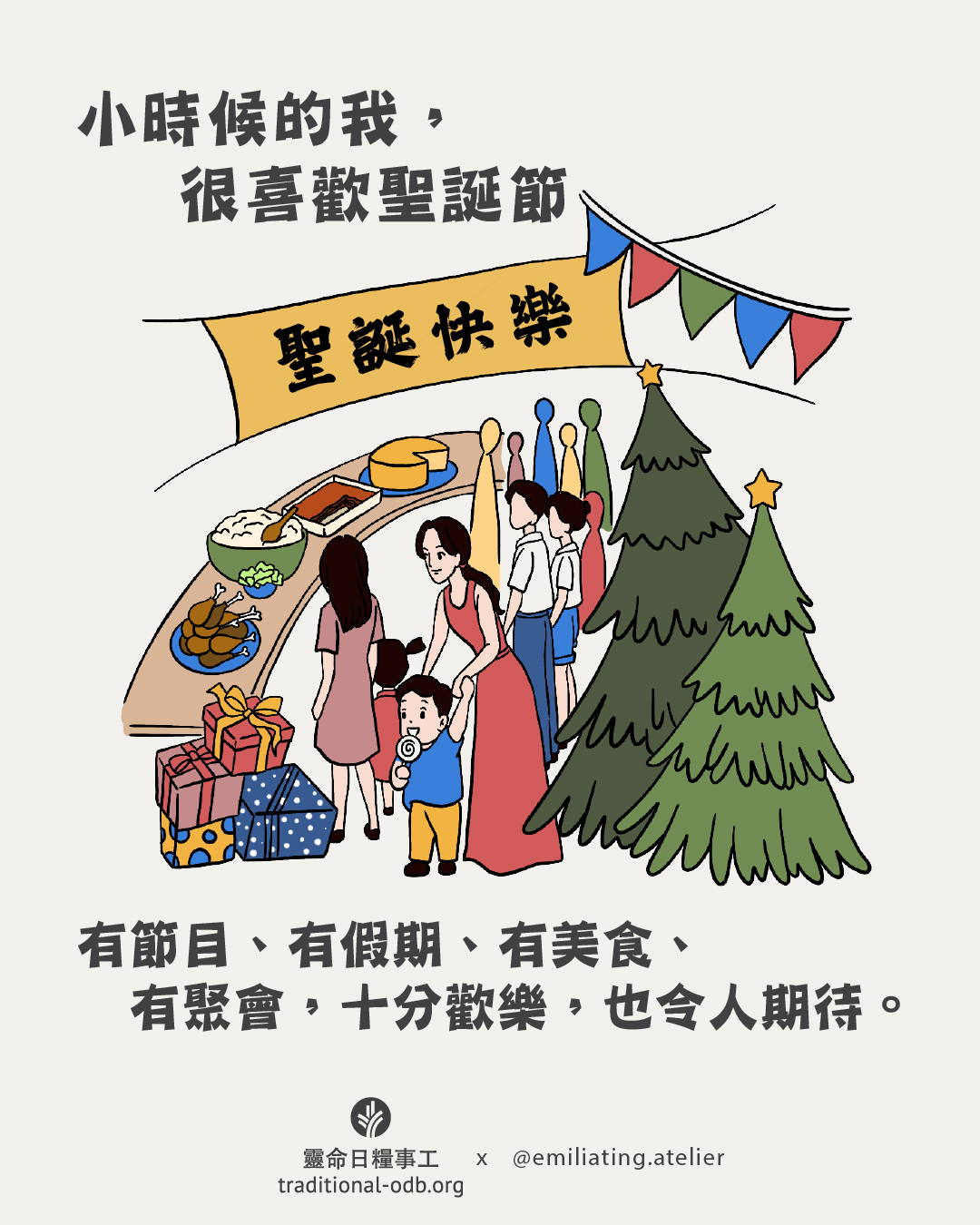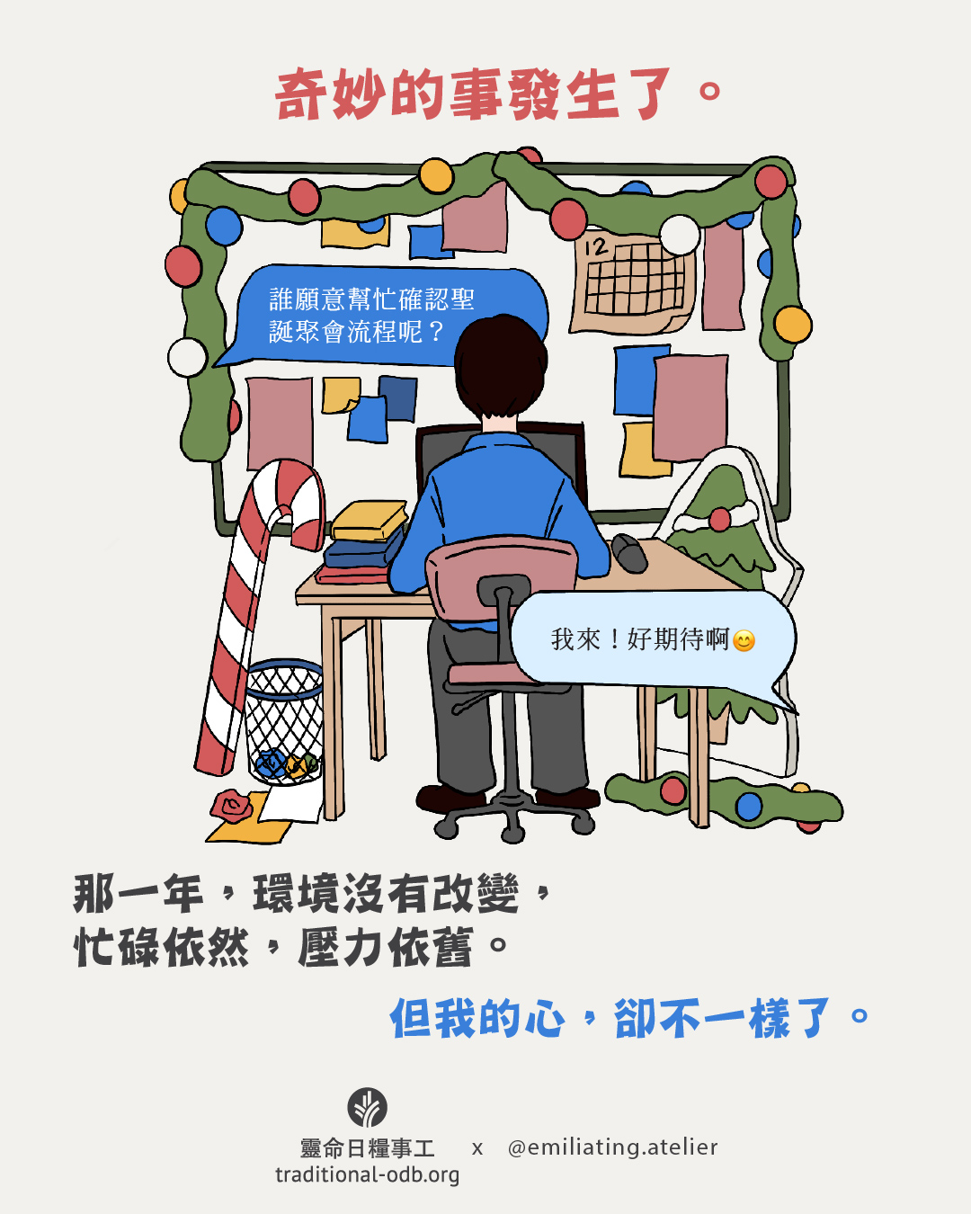 透過這系列插畫,一起看看一個人如何從厭倦節日的忙碌,到重新發現耶穌帶來的喜樂與平安。
